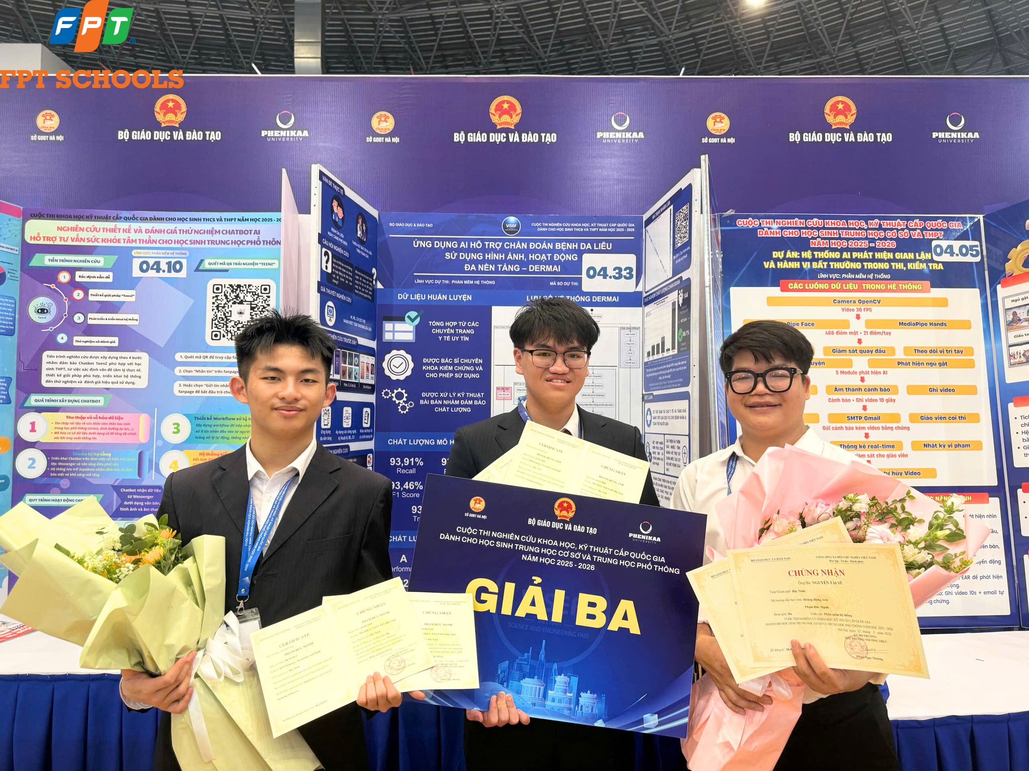 FPT School Bắc Ninh ghi dấu một cột mốc đáng tự hào khi đội thi DermAI xuất sắc giành Giải Ba tại Cuộc thi Nghiên cứu khoa học, kỹ thuật cấp quốc gia dành cho học sinh THCS & THPT năm học 2025–2026. Đây là sân chơi học thuật quy mô lớn, quy tụ những dự án nghiên cứu tiêu biểu và có tính ứng dụng cao từ học sinh trên toàn quốc.