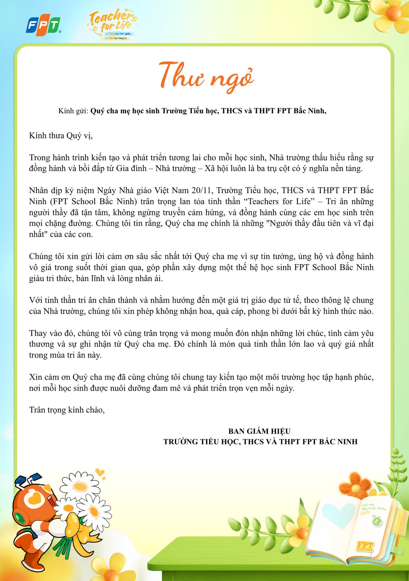 Nhân dịp kỷ niệm Ngày Nhà giáo Việt Nam 20/11, Trường Tiểu học, THCS và THPT FPT Bắc Ninh (FPT School Bắc Ninh) trân trọng lan tỏa tinh thần “Teachers for Life” – Tri ân những người thầy đã tận tâm, không ngừng truyền cảm hứng, và đồng hành cùng các em học sinh trên mọi chặng đường. Chúng tôi tin rằng, Quý cha mẹ chính là những "Người thầy đầu tiên và vĩ đại nhất" của các con.