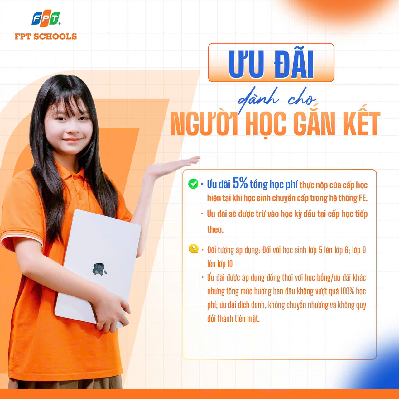 Nhằm khuyến khích sự tiếp nối hành trình học tập trong hệ thống, FPT triển khai chính sách ưu đãi học phí gắn kết dành cho học sinh chuyển cấp nội bộ: